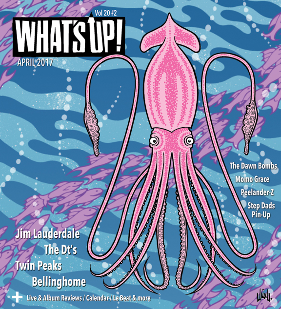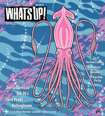 I did a squid cover for the April issue of Bellingham’s long-running What’s Up! magazine, and am profiled in the issue, as is my wife’s band The Dts– See the online version of the interview here—
